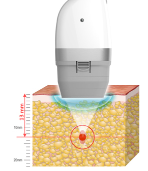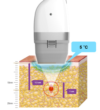 脂肪層の温度が上がるにもかかわらず、皮膚は強力な冷却機能に守られているため火傷の心配はなくまた、痛みも抑えられる治療器です。